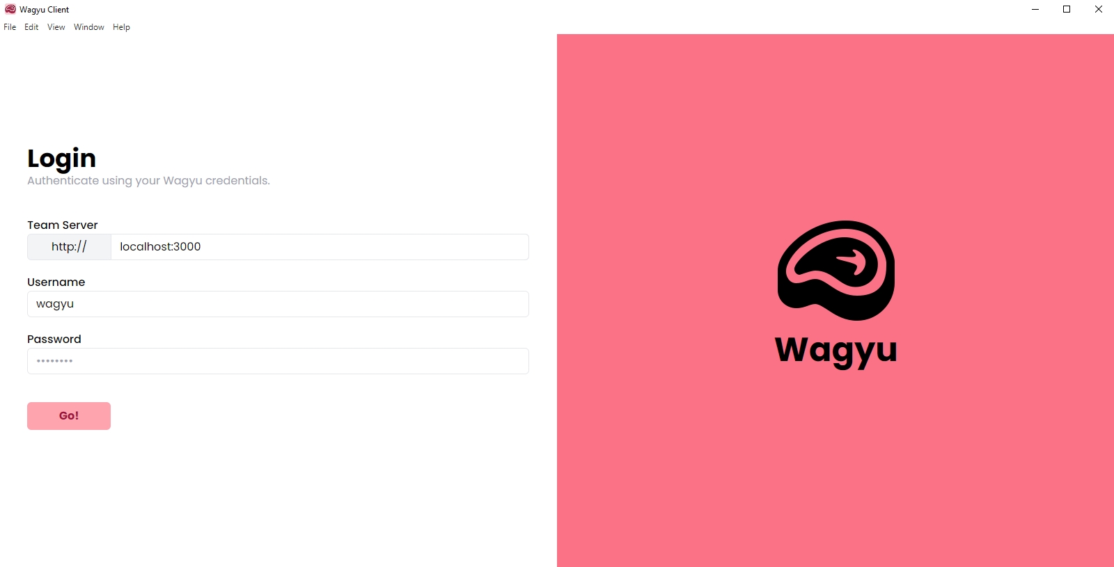 After starting the Wagyu client application you can authenticate into the team server by using the address of the server followed by the default port 3000 (unless changed).